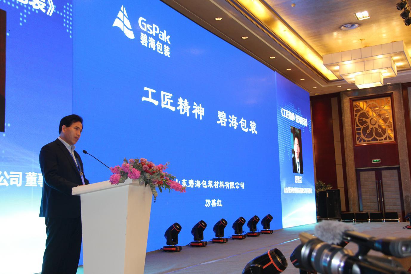 山東碧海包裝材料有限公司董事長厲善紅在第七屆亞洲食品裝備論壇暨中國食品和包裝機械工業(yè)協會第二十七屆年會上做題為《工匠精神 碧海包裝》的發(fā)言